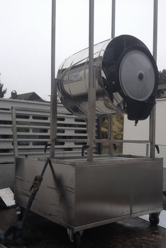 Düsenlose Nebelkanone zur Luftbefeuchtung-Staubbindung mit Mega -Wasserrauch Ventilator.Wurfweite bis ca.15m,Leistung 60L/h ! Optimale mobilität durch Rahmenkonstruktion mit 4 Rädern .Serienmäßig mit 70L Wassertank in Edelstahlausführung.